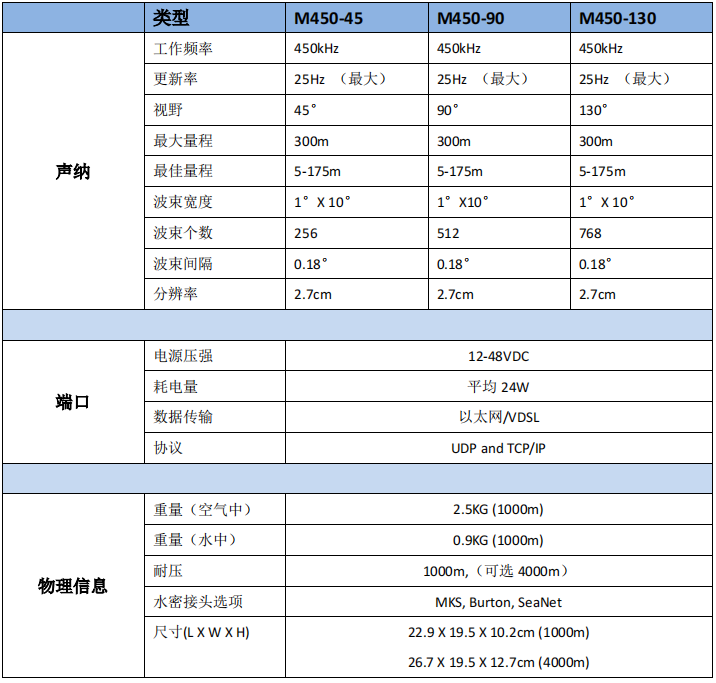 BlueView M450 2D多波束图像声纳系列具有以下特点: